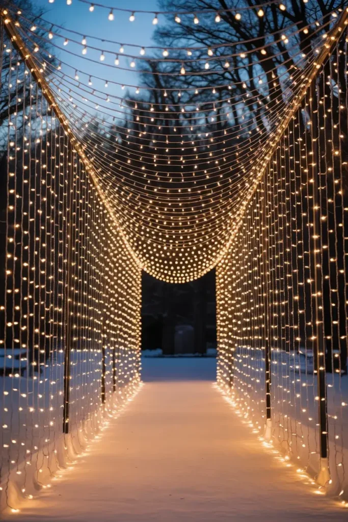 For a truly magical and romantic entrance, hang curtains of twinkle lights. These can be draped over the doorway or used to create a glowing tunnel effect along a walkway.