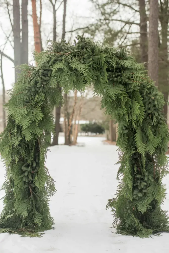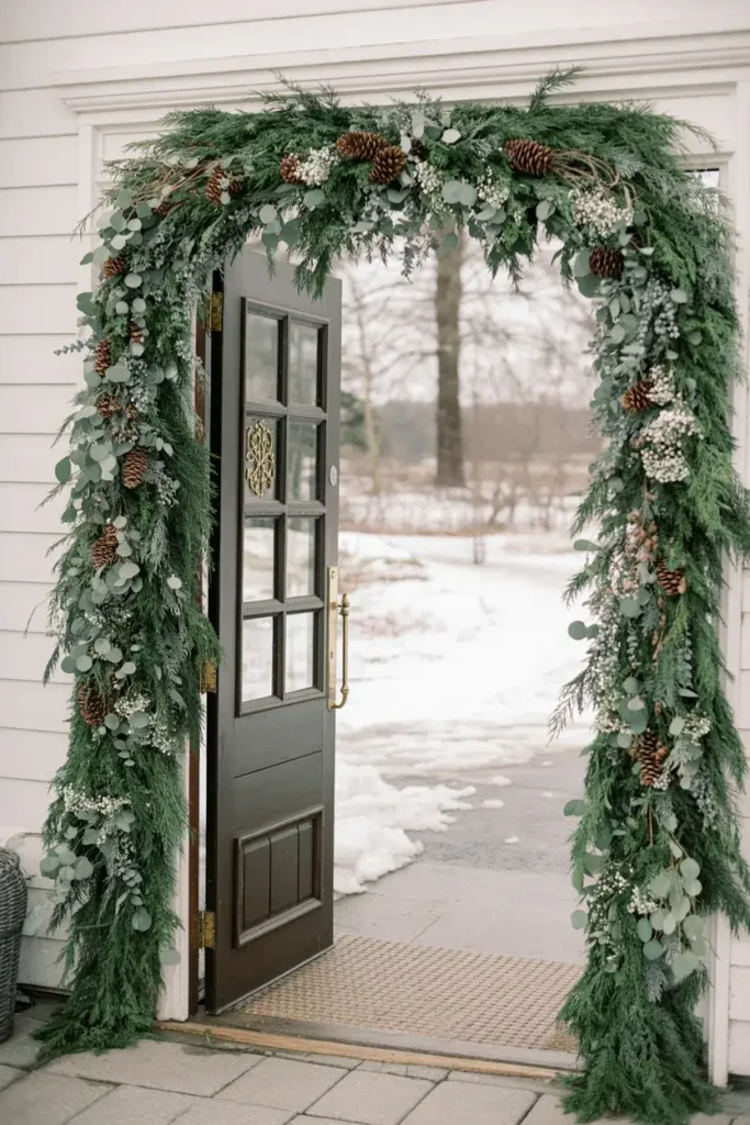 Go all out with a full, lush archway made entirely of evergreen branches. This creates a grand and fragrant entrance that makes guests feel like they are stepping into an enchanted forest.