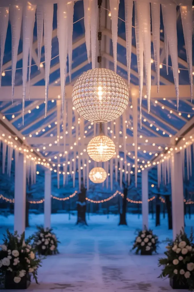 If you’re aiming for a glamorous “ice palace” vibe, hang sparkling crystals and faux icicles from the entrance ceiling or any overhead structures.
