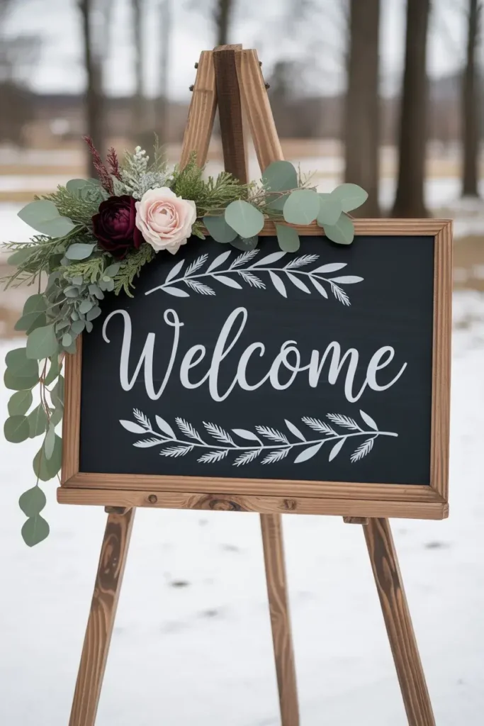 Adorn the sign with a touch of greenery or a few winter blooms that match your overall theme to tie it into the rest of the decor.