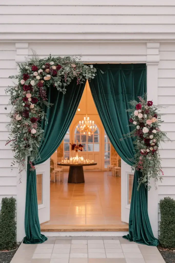 Add a touch of luxury and warmth by hanging heavy velvet drapes at your entrance. Choose rich, wintry colors like emerald green, deep burgundy, or navy blue.