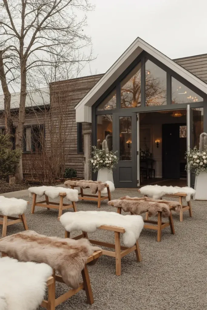 These cozy details invite guests to feel comfortable and warm from the moment they arrive, perfectly complementing a rustic or lodge-style wedding theme.